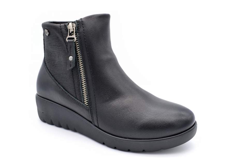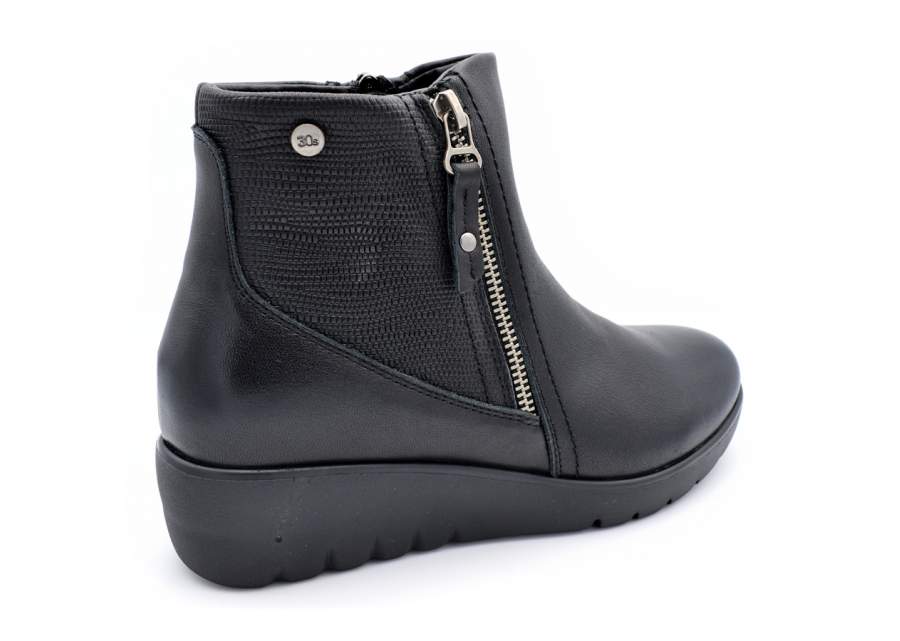 Botín de confort de la marca Treintas. Todo fabricado en piel, de calidad y blanditas. Plantillas extraibles. Botín fabricado con piel napa. Es un botín de cuña media que tiene un look muy arreglado y de grand confort ya que la base del taón es anchita. Modelo de botín de look atractiva,moderno pero sin perder la esencia del confort. Cremallera lateral para favorecer el calzarse y descalzarse. Piso de goma, antideslizante,con buena base y de buen agarre. Horma ancho 8. Altura de piso, 5 cm aprox.