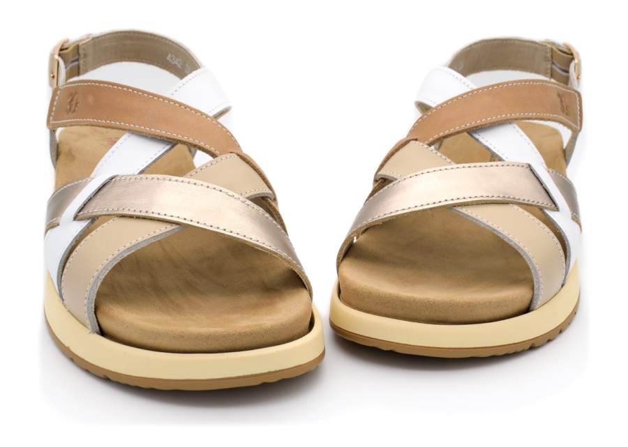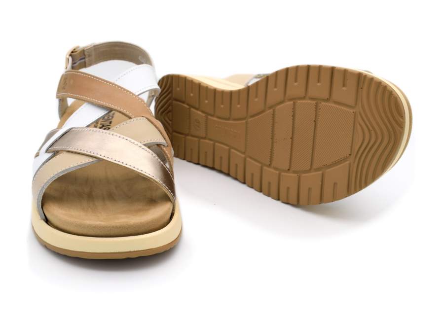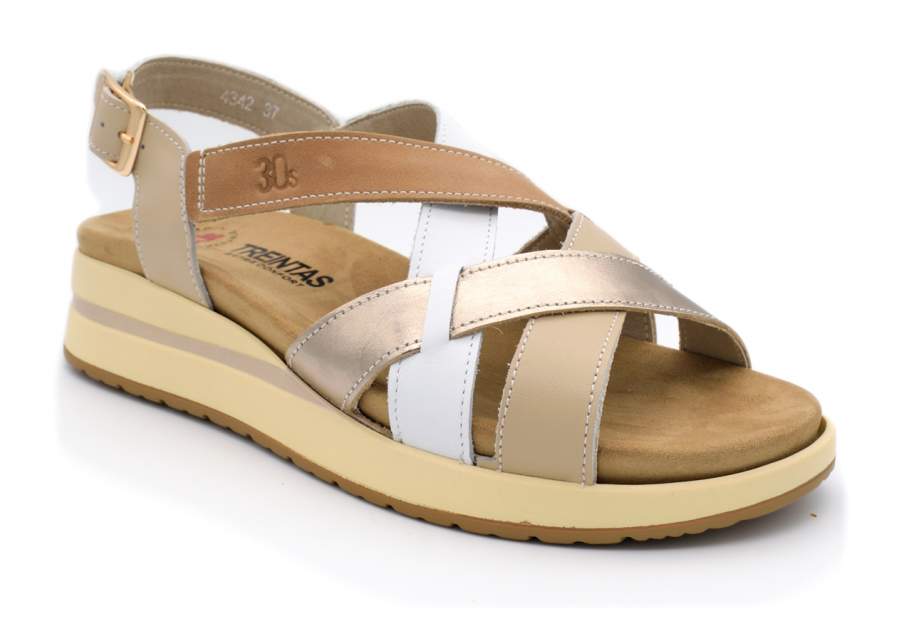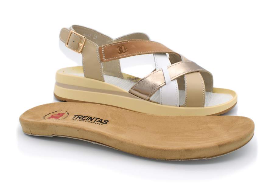 Sandalia de la marca Treintas. Plantillas extraibles. Todo piel. Tiras cruzadas que favorecen mucho al pie, haciendo escote en pico. Horma muy cómoda. Ancho 9. Altura piso, 6 cm aprox.