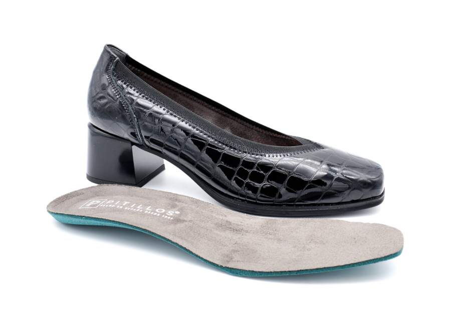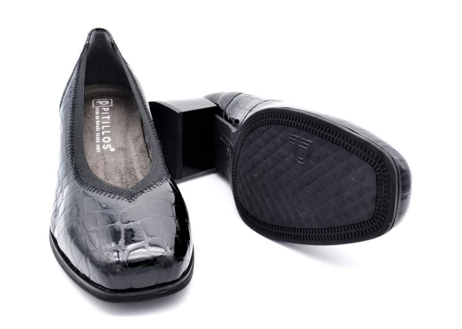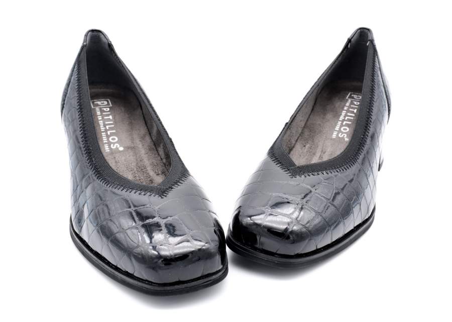 Zapato salón de la marca Pitillos. Fabricado en piel coco charol. elástico en perímetro para favorecer el perfecto ajuste zapato / pie. Forro de tejido ideal para mantener el calorcito y que el pie transpire perfectamente. Piso con buena base, antideslizante y flexible. Plantillas extraíbles. Horma ancho 9. Altura piso 5 cm.