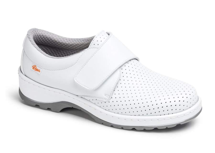 Schoen met klittenbandsluiting, wasbaar in koud en warm tot 40º, D'COVER OEKO-TEX® microvezel snit gevoerd aan de binnenkant van D'DRY®, zeer ADEMEND met een groot vochtabsorberend vermogen en sneldrogend. Rechte leest met afgeronde neus. Hielkap van voldoende hardheid om de calcaneus vast te houden. Gewatteerde stoffen binnenzool op polyurethaanschuim met antibacteriële behandeling en actieve kool. Antibacteriële tweekleurige polyurethaan zool, antislip met een hoge coëfficiënt in droog en nat, met geribbelde accenten op de zool om de afvoer van vloeistoffen te vergemakkelijken. Vervaardigd door montage en veiligheidsstiksels om de verbinding van de zool met de schoensnit te versterken.