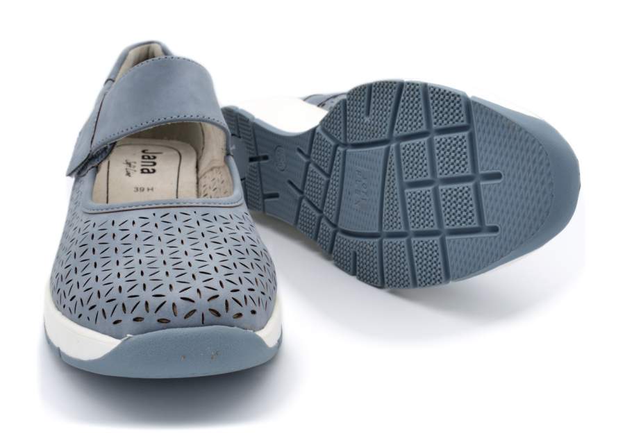 Mycket bekväma Mary Janes från märket Jana. Hackad ovandel för att ge ett mer strömmande utseende och underlätta andningsförmågan. Kardborreknäppning på bladet. Uttagbara innersulor. Polyuretangolv, modern och platt bas. Halkfritt golv och bra underlag.