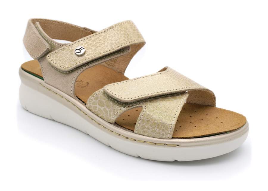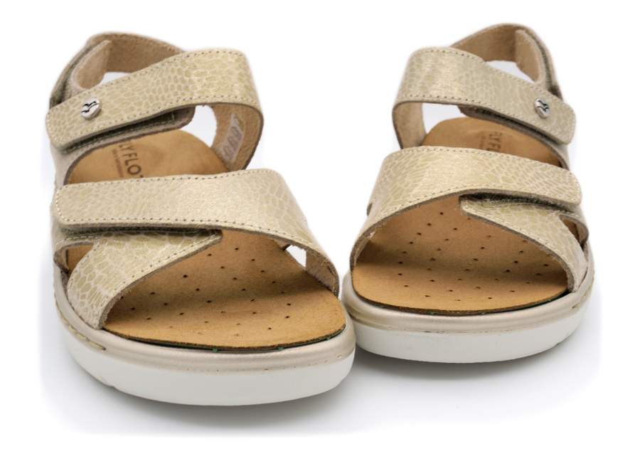 Sandala de la marca de confort FlyFlot. Plantillas extraibles. Regulable mediante 2 tiras de velcro. Piso flexible,ligero y con base amplia para ganar en estabilidad. Horma ancho, 8. Altura piso en talón, 3 cm aprox.